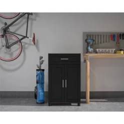 - The Cabinet features 2 adjustable and 1 fixed shelf behind 2 doors to customize your storage. The drawer is ideal for storing away smaller items