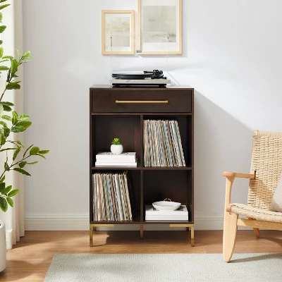 Incorporate streamlined modern storage into your home with the Juno Record Storage Cube Bookcase. Featuring a sleek silhouette and stylish hardware, this bookcase has four cube shelves sized perfectly for standard records as well as books or decor. The drawer offers storage for electronic accessories and cleaning supplies, while the top of the bookcase accommodates a variety of standard record players. Create a dedicated listening room anywhere in your home with the Juno Record Storage Cube Bookcase.