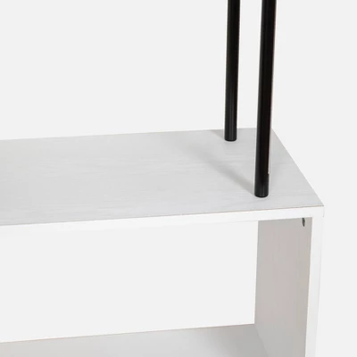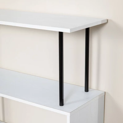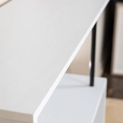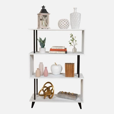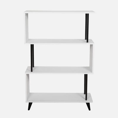 The Danya B Breuer White 4-Tier S-Shaped Modern Floating Rectangular Bookcase with Black Hardware Accents offers a chic and contemporary bookshelf for your modern home or apartment. Utilizing a glossy white tabletop surface, contrasted with black metal hardware, this stylish open shelving bookcase brings some flair and storage to your home office, library, living room, or bedroom. The unique S shape design provides four tiers of shelving platforms to display and organize your favorite books, trinkets, and home décor. The chic yet minimal design ensures this bookcase can be used with versatility without intruding on your existing style. The sleek shelving unit can be implemented as sophisticated accent shelving in nearly any room in your home. Whether you utilize it as a traditional bookshelf or as an open shelving unit, this modern and unique S-Shaped bookcase strikes the perfect balance of style and function for your space.