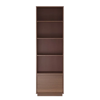 Clean lines and a minimalist approach make this bookcase a seamless addition to nearly any midcentury modern setting. Constructed of solid jequitiba wood, a high-quality Brazilian lumber known for its similarities to mahogany, this piece was built to last and look great doing it. A warm walnut finish brings new character to the natural brown hues and darker streaks in the length of the woodgrain. 4 adjustable shelves create ideal displays for your favorite books, plants, and souvenirs, while a bottom drawer offers out of sight storage for runaway items.