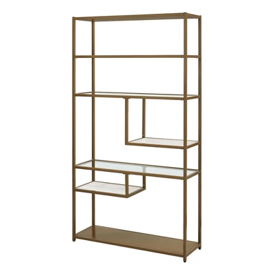 Elevate your living space with the warm elegance, graceful flair and deco-modern design of the Dorel Living Eos Geometric Bookcase Etagere. A wonderful focal point brimming with architectural charm, this handsome étagère features a square tubular metal frame with a soft brass finish, two faux marble shelves placed in a geometric pattern, three sturdy tempered glass shelves and a lower metal shelf. Stylish and compact, the Eos blends sleek sophistication with luxurious charm, giving you a wealth of space to exhibit your favorite books, collectable or accents. A pronounced example of strength and beauty, the open geometric design gives this luxe, modern unit considerable and creative storage and display solutions. The Dorel Living Eos Geometric Bookcase Etagere conveys a stylish and clean design that compliments any room, making it the perfect addition to your home.