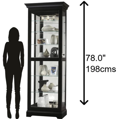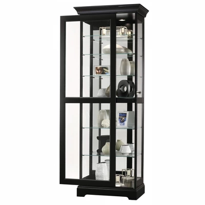 - Careful Craftsmanship: Howard Miller delivers beautiful craftsmanship with this glass display cabinet. The front door of this curio cabinet slides in both directions for easy access to the shelves. A black satin finish on select hardwoods and veneers adds to the piece’s elegance.