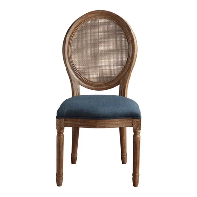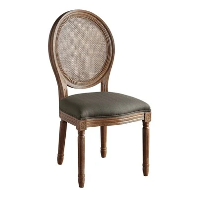 Embody French styled sophistication in your home with the Stella cane oval back chair. Beautifully fashioned, the natural authentic cane back and rustic finish enhance the look of any room. Graceful features like the scalloped front edge,fluted turned legs, and trim piping detail add classic appeal. Enjoy long dinner conversations in comfort on the liberally padded seat with durable sinuous spring support, wrapped in high performance, easy care fabric. This elegant chair is a perfect addition to your dining room, as an accent chair, or accompanying a writing desk.