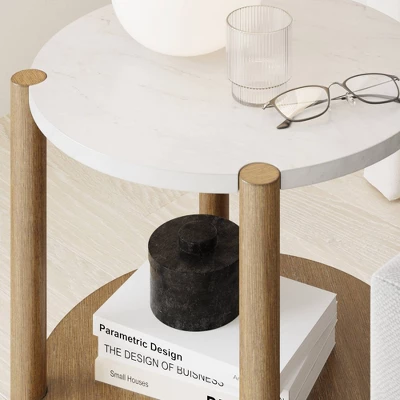 - The accent bedside table will add character and elegance to your room with its wood and marble mix-material look. It can be used as a sofa end table or a bedside table in your bedroom. Tucker is also perfect as a nursery side table.