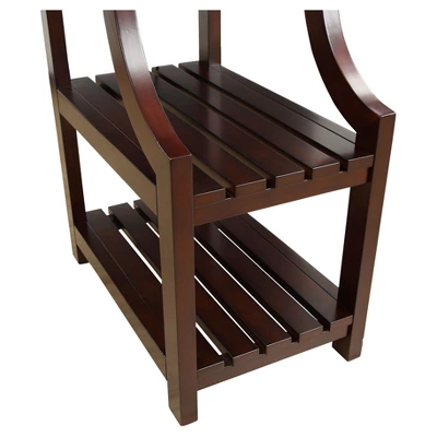 Keep cords more manageable and your space looking tidy with the help of the Espresso Brown End Table with Plug-Ins. A single cord extends from the table into your wall socket, so your lamps, chargers and more can simply plug in to the back of the table, with two sockets and two USB ports. Three shelves provide plenty of space for lamps, books, decor and more, with slatted lower shelves and a sloping frame leading to a small tabletop, providing extra visual interest.